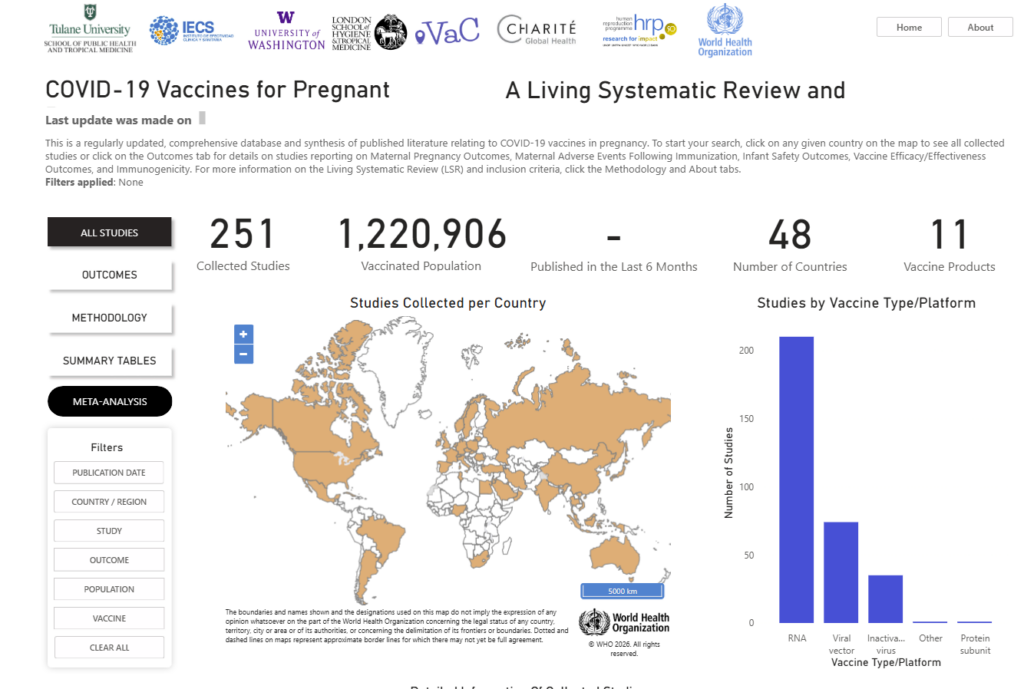 This page highlights a webinar demonstrating the Safe in Pregnancy / Safe in Children platform—an interactive hub that brings together real-time evidence through Living Systematic Reviews and meta-analyses on the safety, effectiveness, and immunogenicity of vaccines, with a focus on pregnant persons, children, and adolescents.